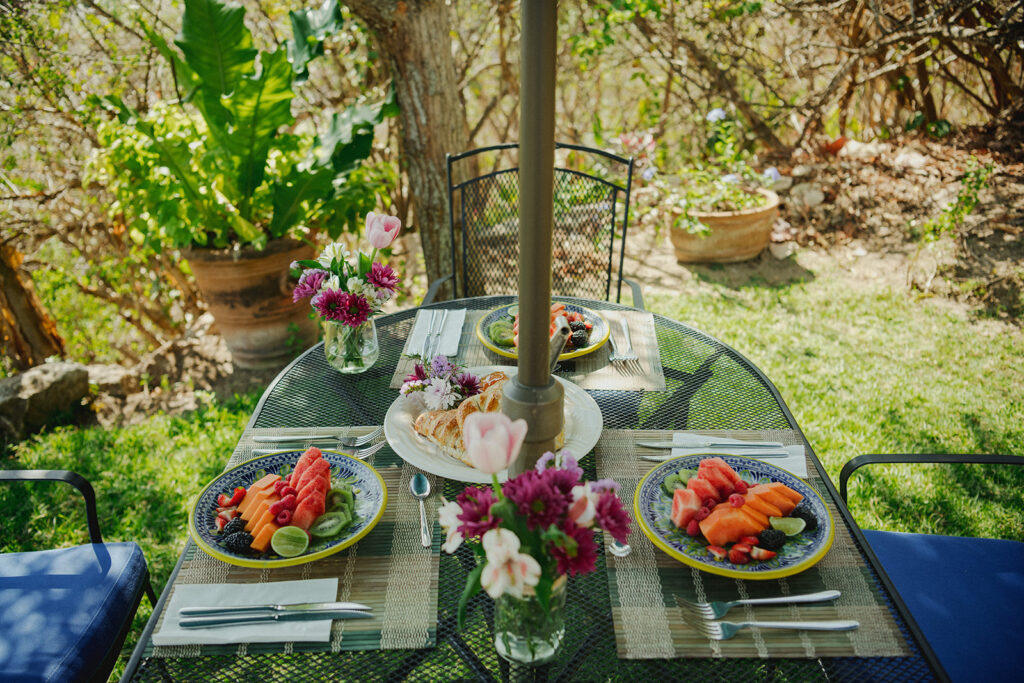 Coffee and fresh squeezed juice is offered in the mornings. Tea, purified water and fresh fruit water are available all day. Beer, wine and margaritas are available for purchase in the afternoons and at dinner.